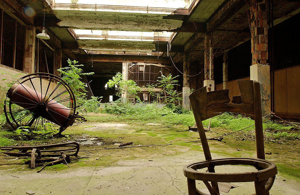 Rain cascades from broken skylights… weeds thick as tree branches… veils of ivy… steel beams so rusted… buildings soon collapse.